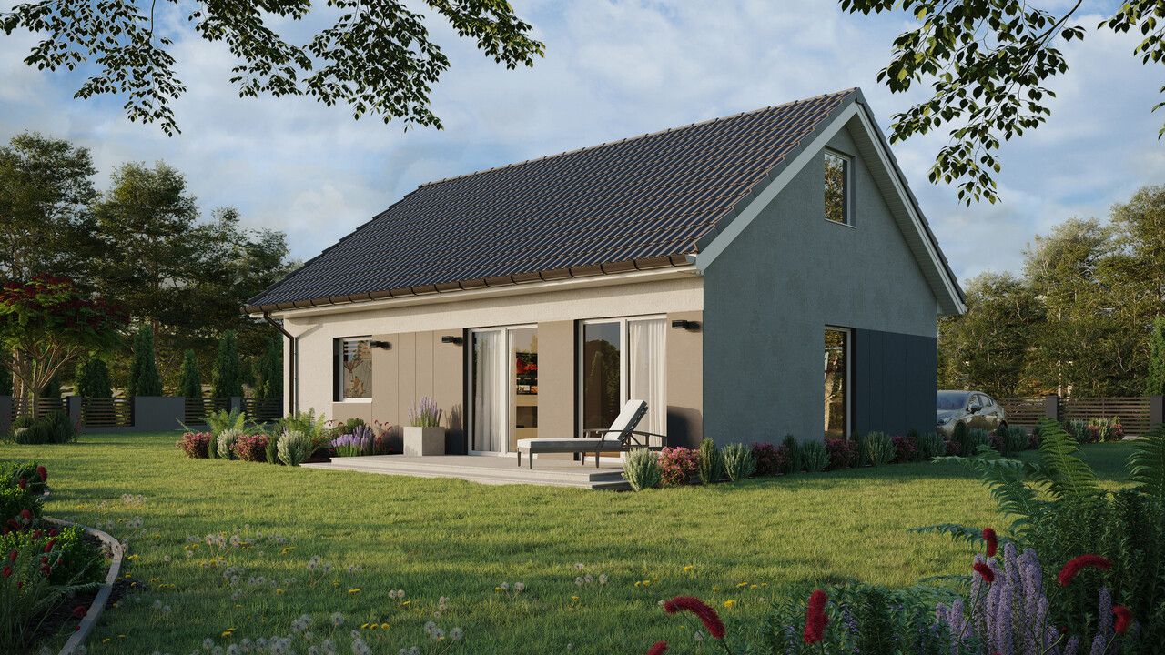 ERDOL 1 XL in der gewählten Konfiguration hat ein Satteldach mit nutzbarem Dachgeschoss mit einer Neigungswinkel 35 Grad und ist mit EUROCOLOR SYNEGO PVC-Tischlerarbeiten auf einem 80 mm breiten Profil der Marke REHAU in den Farben Weiß ausgestattet.