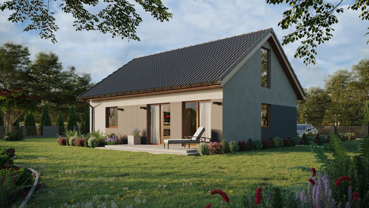Das Haus ERDOL 1 XL ist eine erweiterte Version des Hauses ERDOL 1. Das Haus mit einer Fläche von 74 m² (116 m² in der Version mit nutzbarem Dachgeschoss) bietet seinen Bewohnern einen komfortablen Raum, in dem alles, was sie brauchen, ist. Seine geringe Größe macht es einfach und kostengünstig in der Instandhaltung. Für den Bau wird KVH-Holz verwendet, das die Grundlage der gesamten Struktur bildet. Dank energiesparender Lösungen Planung verhindert es Energieverluste und ist umweltfreundlich.