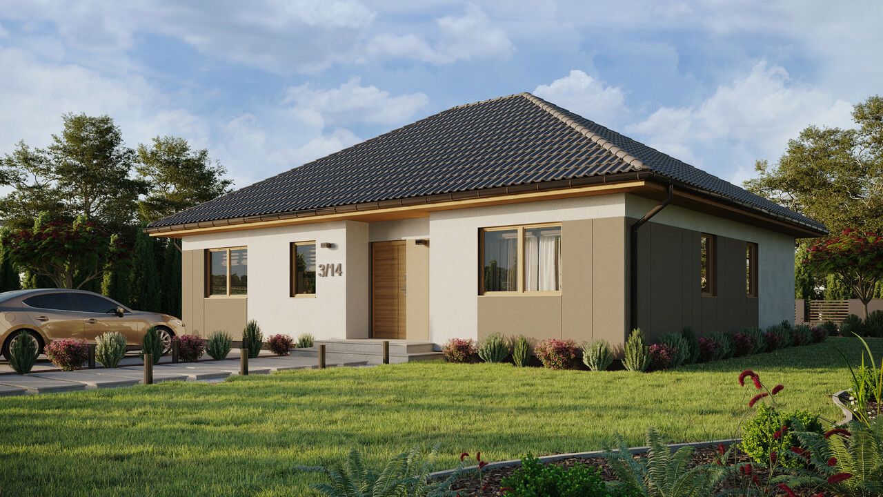 ERDOL 104, wie der Name schon sagt, hat 104 m² (plus 25 m² Dachboden) Wohnfläche. Es ist eine gute Wahl für Menschen, die ein kleines, aber sehr funktionelles Haus in einer optisch attraktiven Form mit einem eleganten Walmdach suchen. Für den alltäglichen Komfort sorgen u.a. 2 Bäder und eine Terrasse mit einem Laubengang am Eingang, dank dem man bei jedem Wetter gerne nach draußen geht. Neben dem Komfort ist das Haus auch ökologisch - die Instandhaltungskosten wurden durch den Einsatz moderner Lösungen und Materialien, die die Innenräume wirksam vor Wärmeverlusten schützen, auf ein Minimum reduziert.