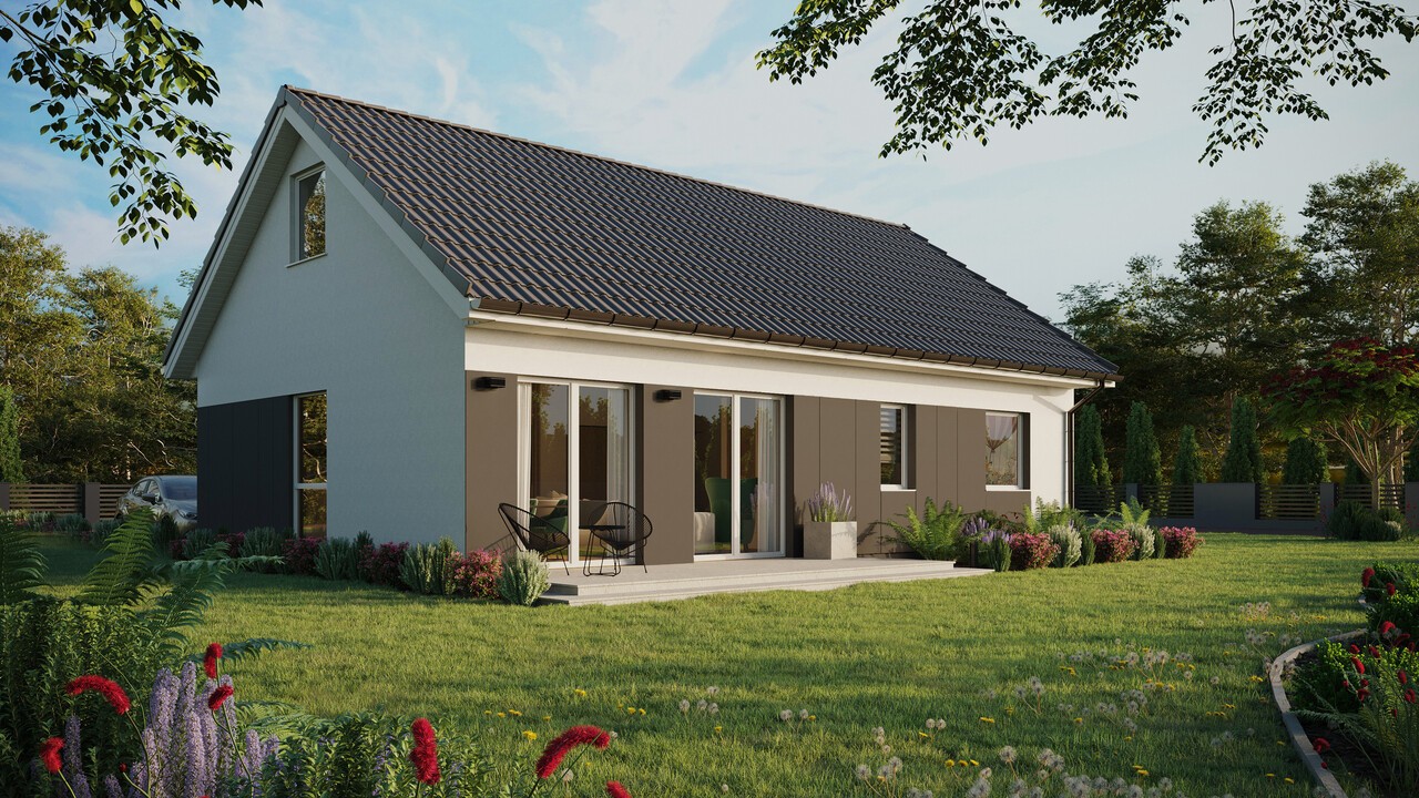 ERDOL 2 XL in der gewählten Konfiguration hat ein Satteldach mit nutzbarem Dachgeschoss mit einer Neigungswinkel 35 Grad und ist mit EUROCOLOR SYNEGO PVC-Tischlerarbeiten auf einem 80 mm breiten Profil der Marke REHAU in den Farben Weiß ausgestattet.