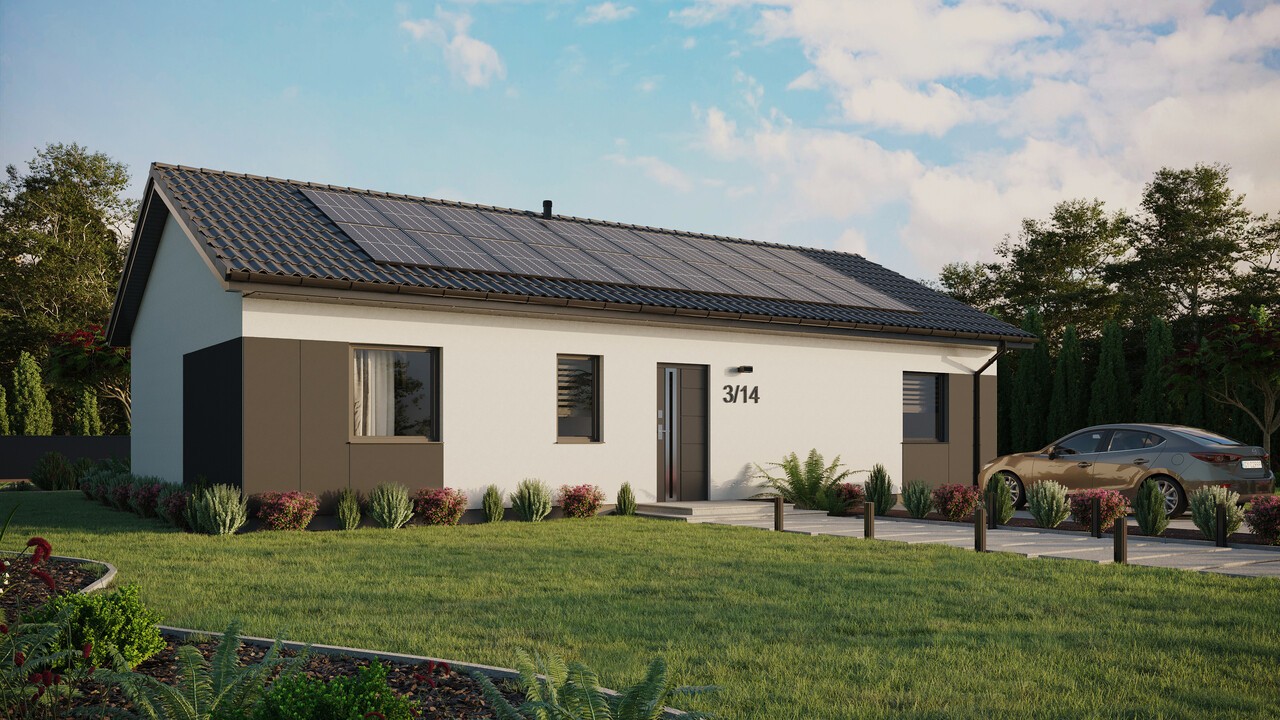 ERDOL 3 XL in der gewählten Konfiguration hat ein Satteldach ohne nutzbares Dachgeschoss mit einer Neigung von 25 Grad und ist mit EUROCOLOR SYNEGO PVC-Tischlerarbeiten auf einem 80 mm breiten Profil der Marke REHAU in den Farben Anthrazit ausgestattet.