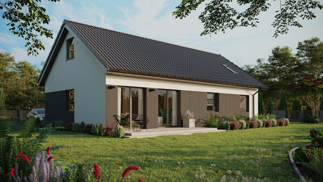 Das Projekt ERDOL 3 XL Haus mit einer Fläche von 97 m² (151 m² in der Version mit nutzbarem Dachboden) ist ein Projekt für Menschen, die mehr komfortablen Platz im Alltag haben wollen. Das Haus in dieser Version ist ein erweitertes ERDOL 3, dank dem es möglich war, die Fläche des Wohnzimmers zu vergrößern und eine separate Treppe (bei der Version mit nutzbarem Dachboden) oder einen zusätzlichen Hauswirtschaftsraum (bei der Version ohne nutzbaren Dachboden) einzurichten. Wenn Sie mehr Raum wünschen, ist dieses Projekt ideal für Sie. Die modernen Technologien und ökologischen