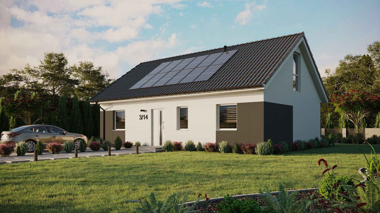 ERDOL 3 in der gewählten Konfiguration hat ein Satteldach mit nutzbarem Dachgeschoss mit einer Neigungswinkel 35 Grad und ist mit EUROCOLOR SYNEGO PVC-Tischlerarbeiten auf einem 80 mm breiten Profil der Marke REHAU in den Farben Weiß ausgestattet.