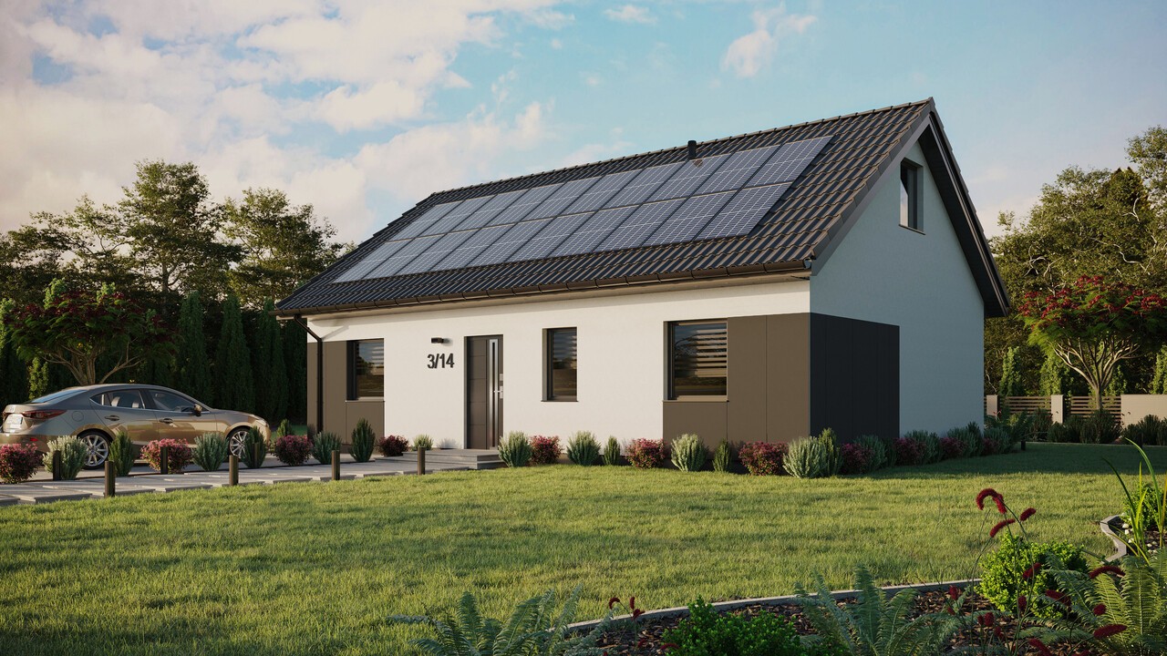 ERDOL 3 in der gewählten Konfiguration hat ein Satteldach mit nutzbarem Dachgeschoss mit einer Neigungswinkel 35 Grad und ist mit EUROCOLOR SYNEGO PVC-Tischlerarbeiten auf einem 80 mm breiten Profil der Marke REHAU in den Farben Anthrazit ausgestattet.