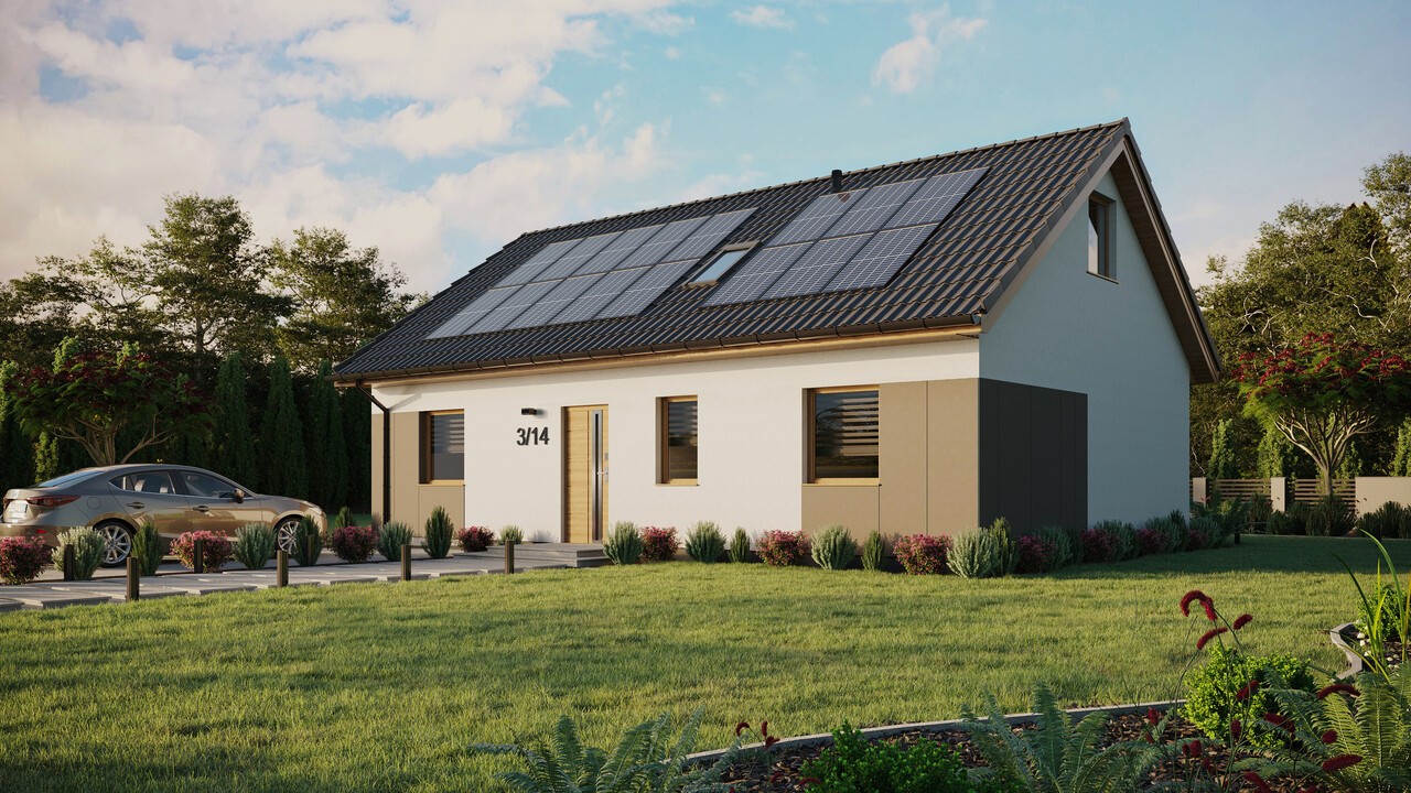 ERDOL 3 in der gewählten Konfiguration hat ein Satteldach mit nutzbarem Dachgeschoss mit einer Neigungswinkel 35 Grad und ist mit EUROCOLOR SYNEGO PVC-Tischlerarbeiten auf einem 80 mm breiten Profil der Marke REHAU in den Farben Winchester ausgestattet.