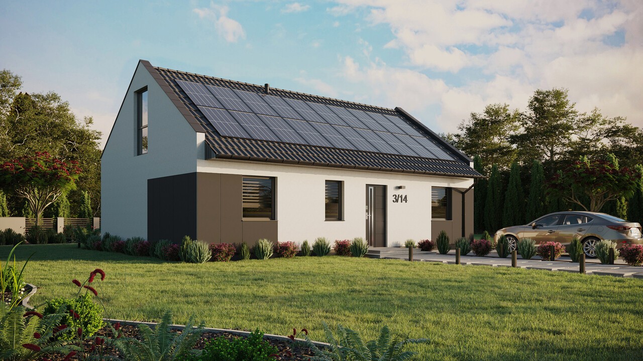 ERDOL 3 in der gewählten Konfiguration hat ein Modernes Steildach mit nutzbarem Dachboden mit einem Neigungswinkel von 35 Grad und ist mit EUROCOLOR SYNEGO PVC-Tischlerarbeiten auf einem 80 mm breiten Profil der Marke REHAU in den Farben Anthrazit ausgestattet.